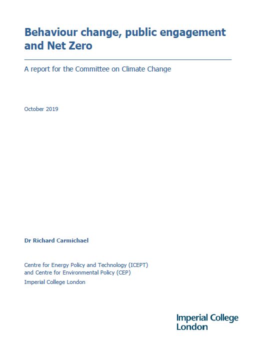 Carmichael, Richard. “Behavior change, public engagement, and Net Zero.” 10 October 2019. Committee on Climate Change, Centre for Energy Policy and Technology and Centre for Environmental Policy, Imperial College London. https://www.theccc.org.uk/publication/behaviour-change-public-engagement-and-net-zero-imperial-college-london/behaviour-change-public-engagement-and-net-zero-richard-carmichael/