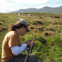 Brian surveying with the CMD at Mývatn while Doug takes GPS points. You can’t see Doug’s face, because it is covered with mosquito netting.